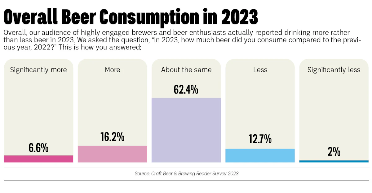 Beer-drinking habits continue to evolve in unexpected ways, whether it’s adding nonalcoholic drinks to a beer purchase, younger drinkers being more likely to prefer packaged beer over draft—are bottles getting cool again?—or beer consumption itself defying common assumptions, such as the modest increase among our (admittedly self-selected) audience. Here, we plot a few interesting points.