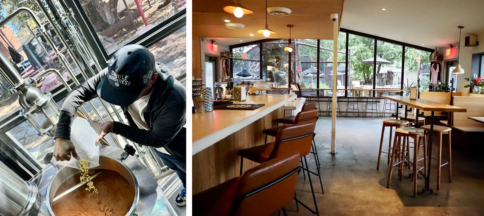 Hold Out has a special weapon in that regard: It’s a sibling business to Better Half Coffee & Cocktails, situated directly across the property from the brewery. The two share a porous patio area, and guests can freely come and go between the two. Two window walls—one at the coffeeshop/bar and one at the brewery—offer views each way. The windows, a large investment that cost in the low six figures, say something about the owners’ approach: Better Half and Hold Out work in tandem, offering a one-stop shop for diverse groups of guests while offsetting each other’s quieter periods.