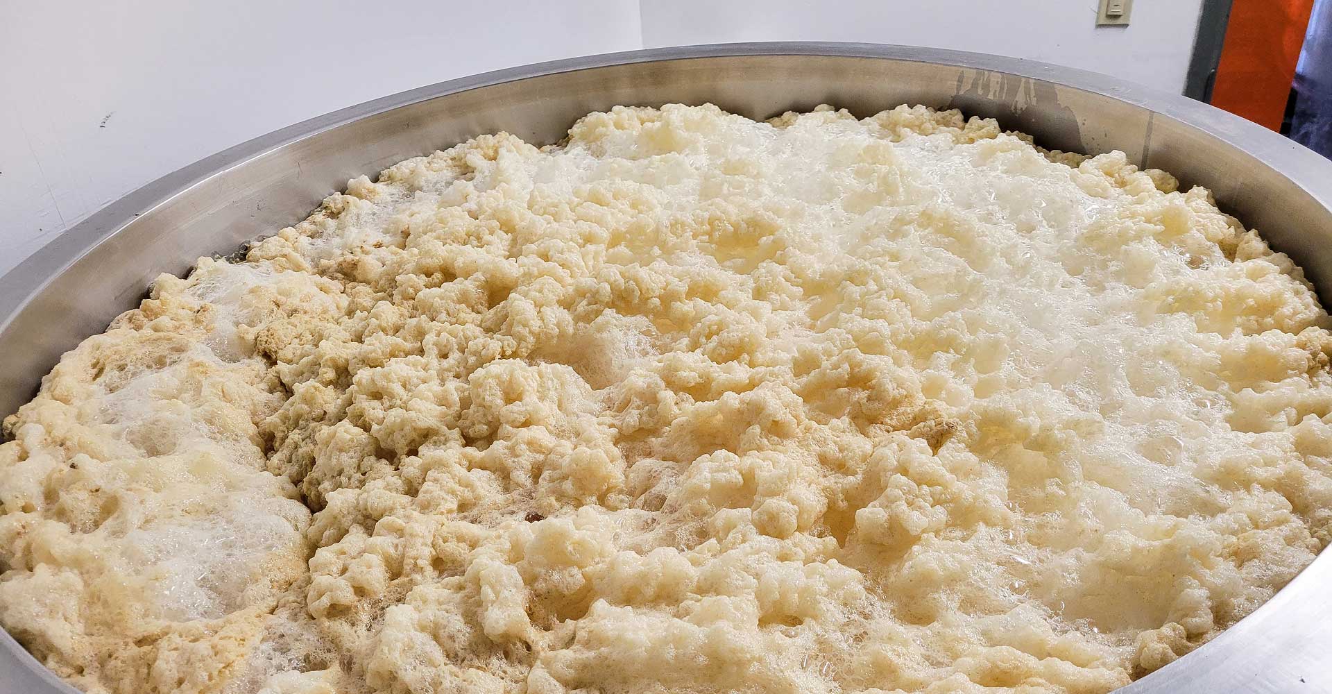 Primary fermentation takes four to six days—five is typical. “And then we’ll rack to a brite tank and usually package the next day or the day after.”