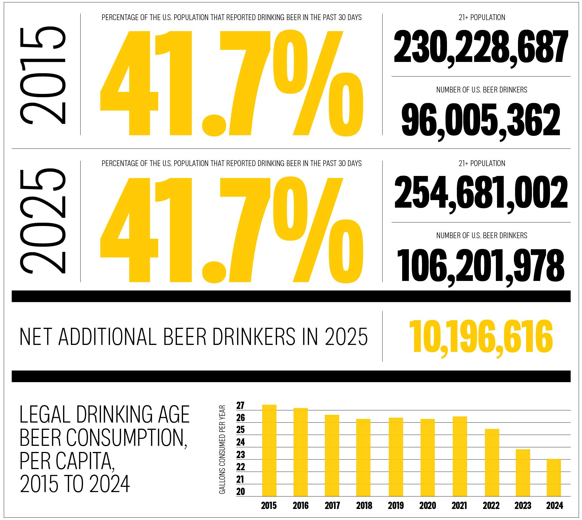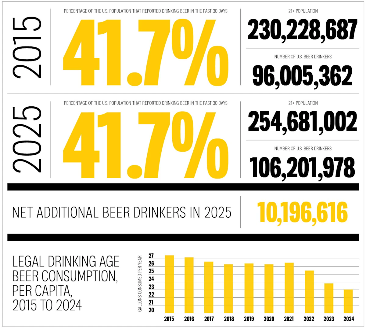 Statistics shared in October 2025 by National Beer Wholesalers Association chief economist Lester Jones—gathered by Scarborough Research and presented in collaboration with Fintech—paint a somewhat different picture. Instead, these numbers suggest that the real issue facing the industry isn’t nondrinkers. In fact, there are apparently more U.S. beer drinkers than ever—but they are simply drinking less, per capita.