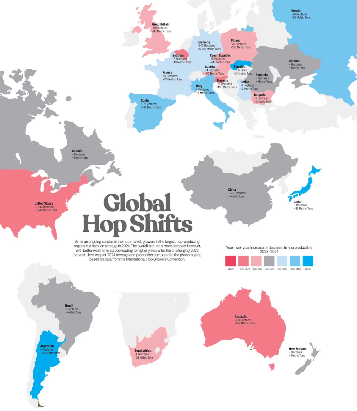 Amid an ongoing surplus in the hop market, growers in the largest hop-producing regions cut back on acreage in 2024. The overall picture is more complex, however, with better weather in Europe leading to higher yields after the challenging 2023 harvest. Here, we plot 2024 acreage and production compared to the previous year, based on data from the International Hop Growers Convention.
