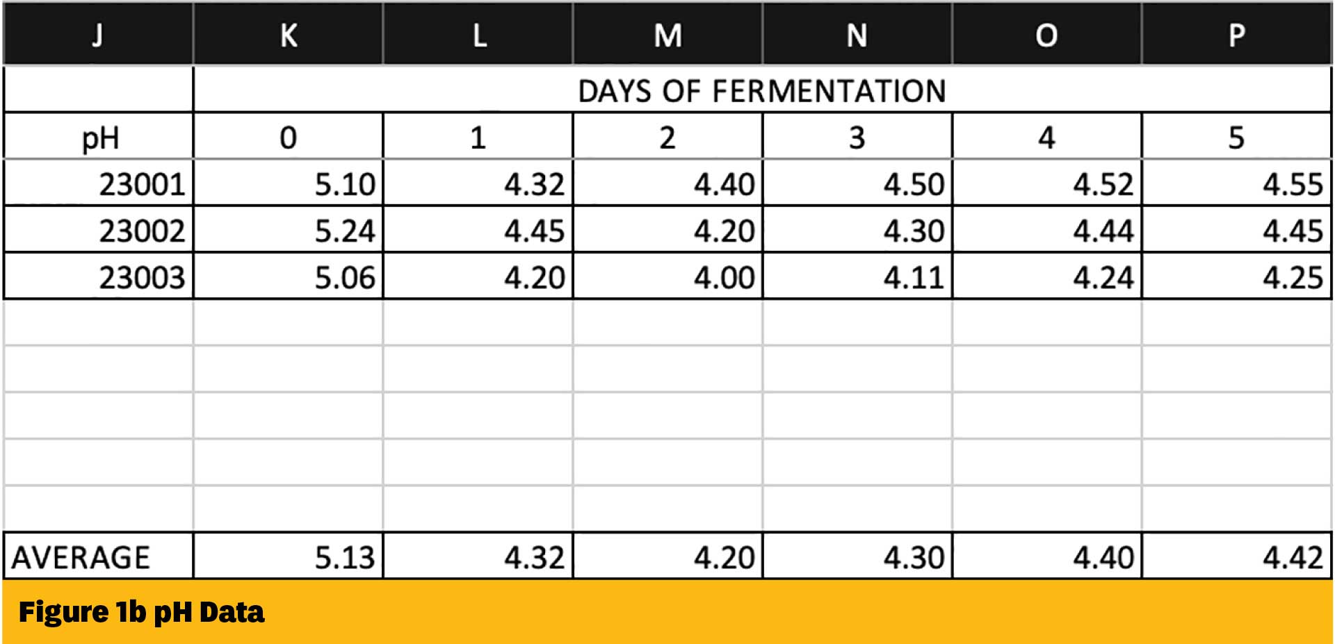 On the right side of the sheet, do the same with your pH data for each batch (Figure 1b). Here, instead of having targets, it makes the most sense to just include the average curve for your pH readings. To add more batches above the Average rows, simply insert rows as needed. This also applies to adding days of fermentation by inserting columns to the right of your data. Copy this template over to subsequent tabs for each brand you’re choosing to track. Input your data as far back as you want to go. The more data points you have, the more accurate and useful the average will be.