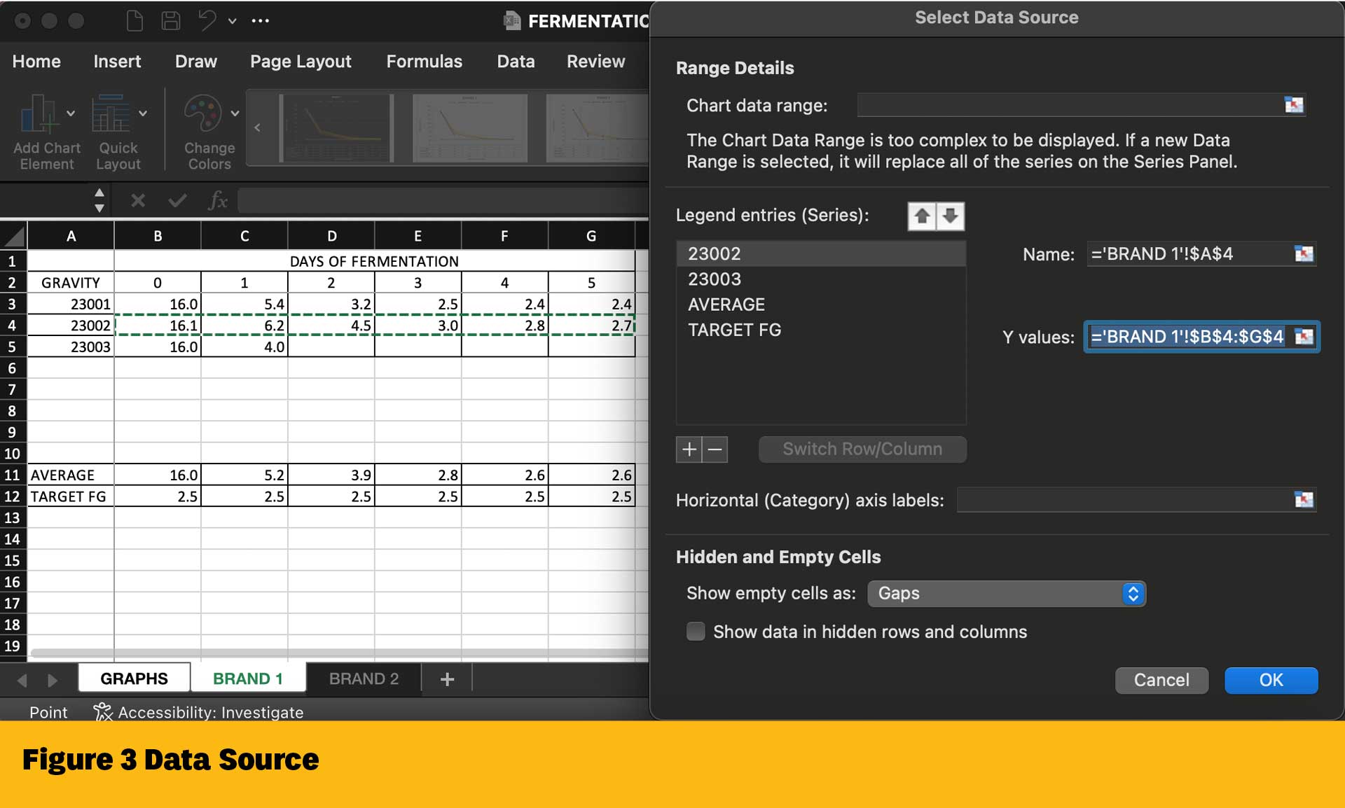 Next, begin to select your data to add to your graph. You’ll want to include three series: one for your current batch being tracked, one for the average, and one for the target final gravity. In Excel’s Select Data Source box (Figure 3), select your horizontal gravity or pH data for each series in the Y values. The horizonal (category) axis label is your Days of Fermentation, starting at zero.